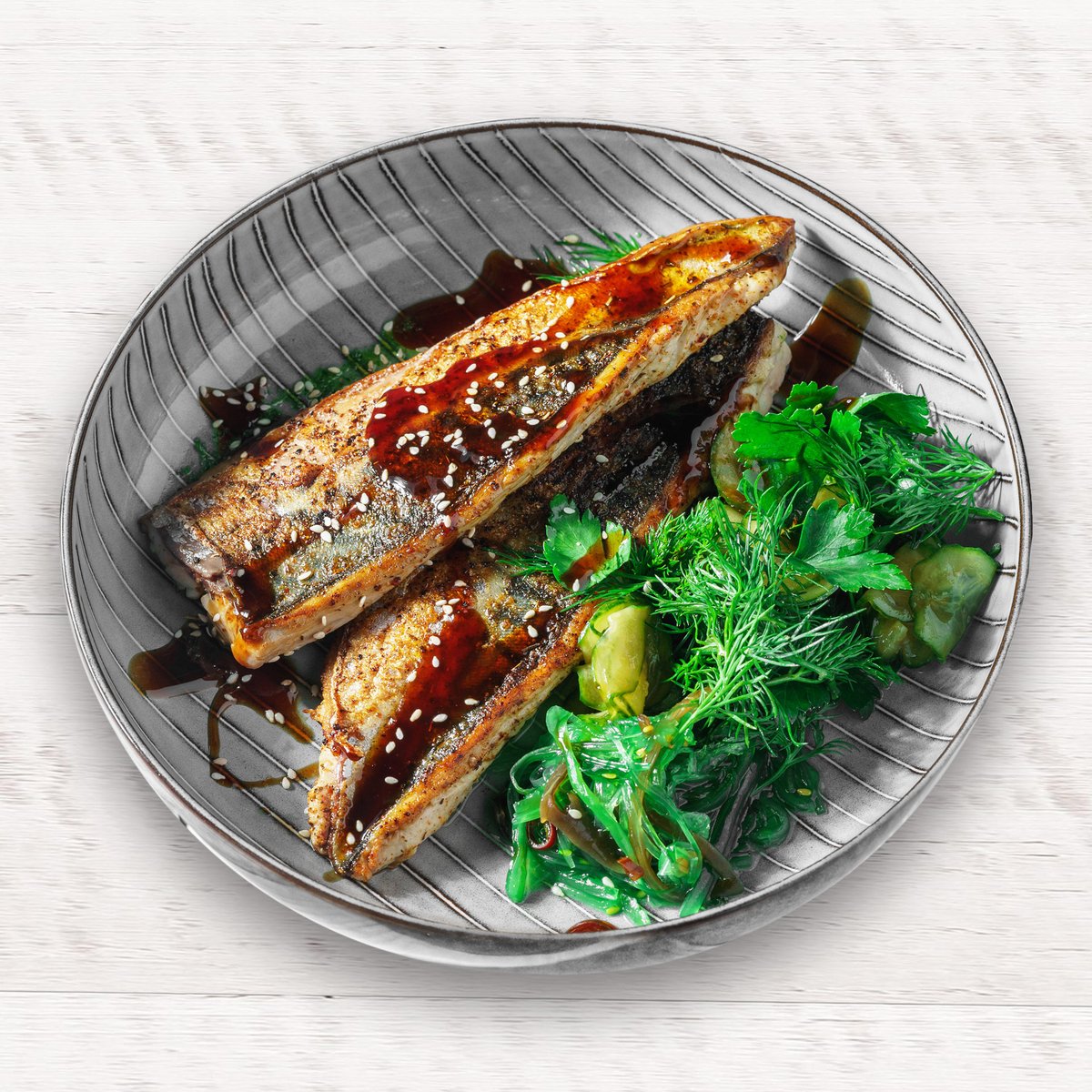 Креветки, лосось, кальмар на гриле с соусом чивас ригал и гарниром рис-микс со сливками