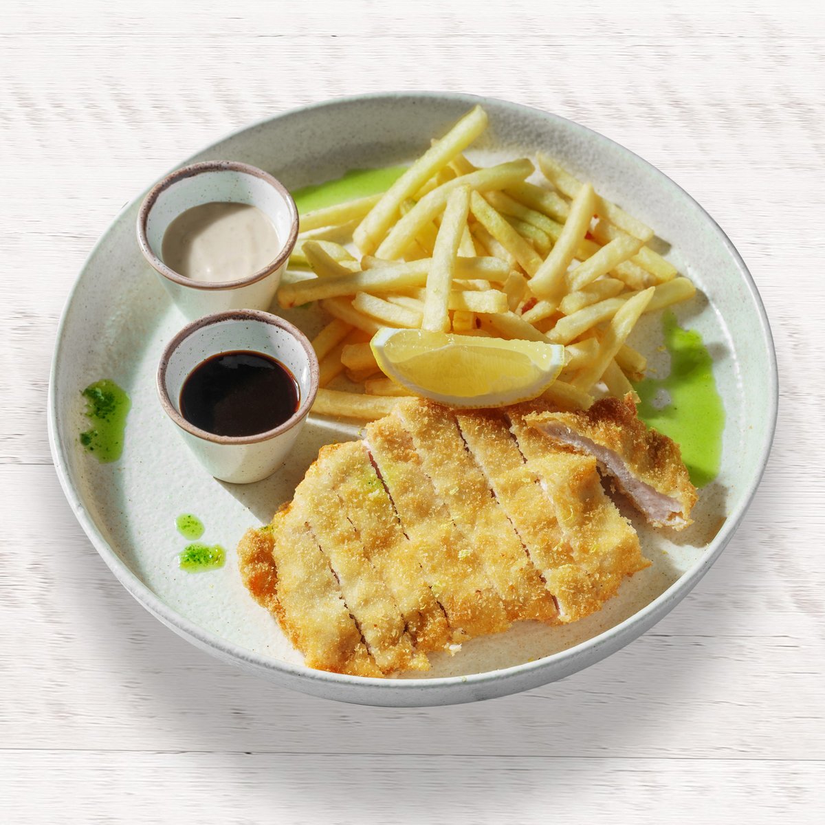 Обжаренная на гриле сочная куриная котлетка, на подушке из молодого сыра Моцарелла с печеными на оливковом масле томатами и свежим базиликом . На гарнир картофель фри