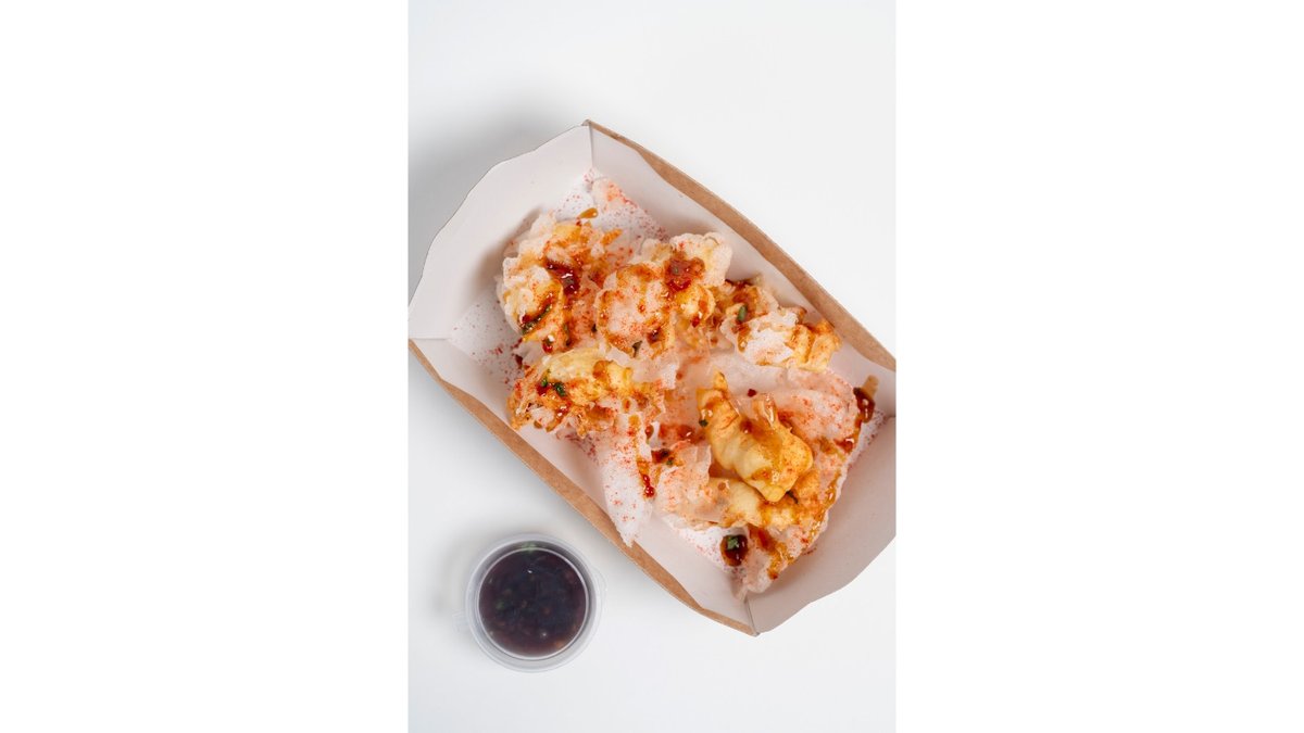 Нежные креветки в воздушной панировке с хлопьями хрястящего риса,заправляется с кисло-сладким соусом