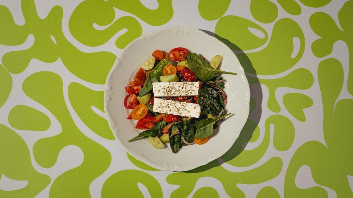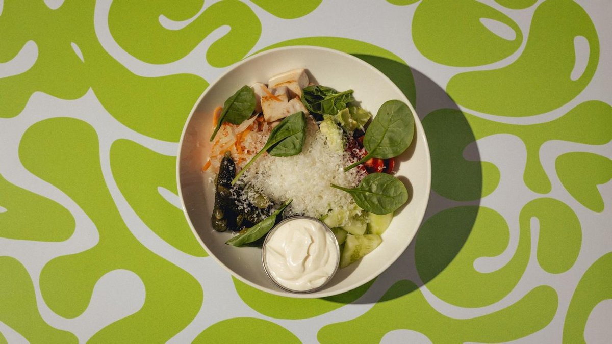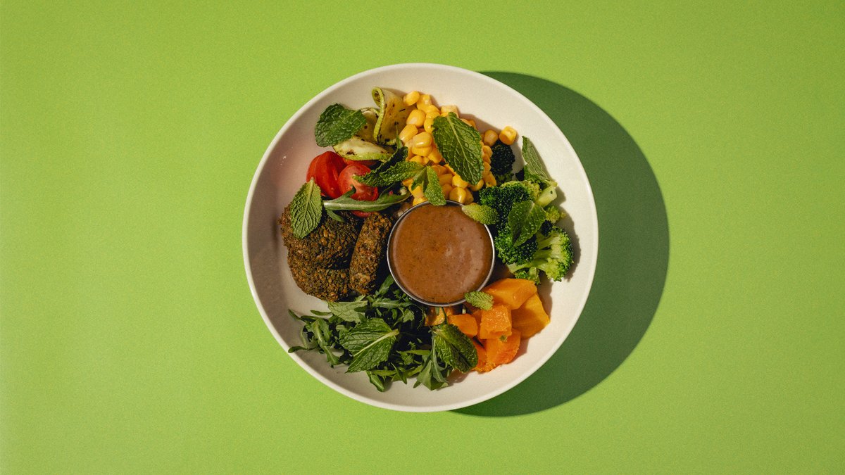 Фалафель из нута, томаты, маринованные огурцы, шпинат, соус из кефира, тахини, айоли