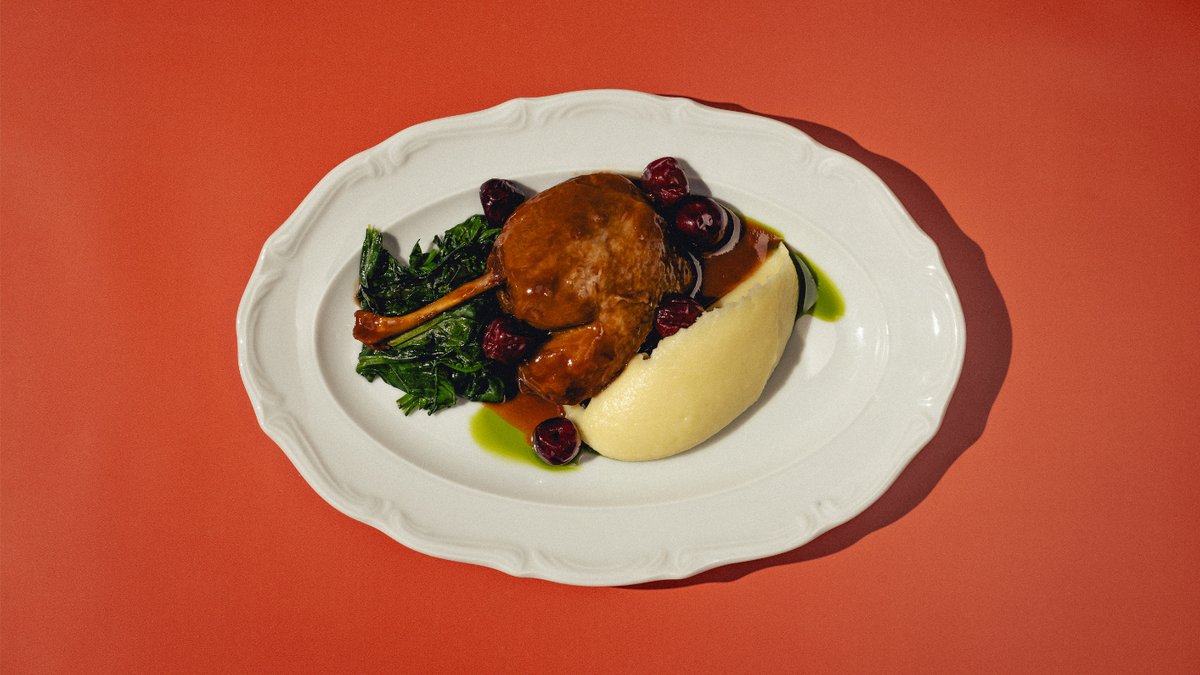 Томлёное ребро конины с картофельным пюре и миксом салата