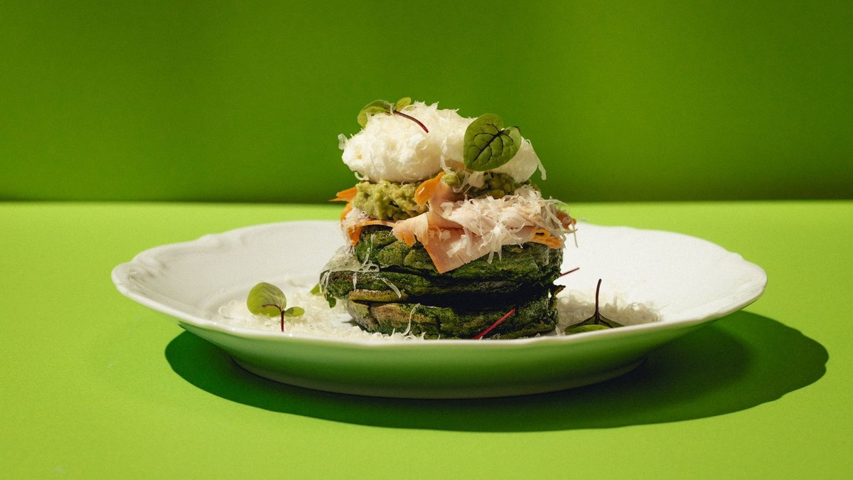 Яйцо пашот с зелеными вафлями, творожный крем, микс зелени и маринованная форель
