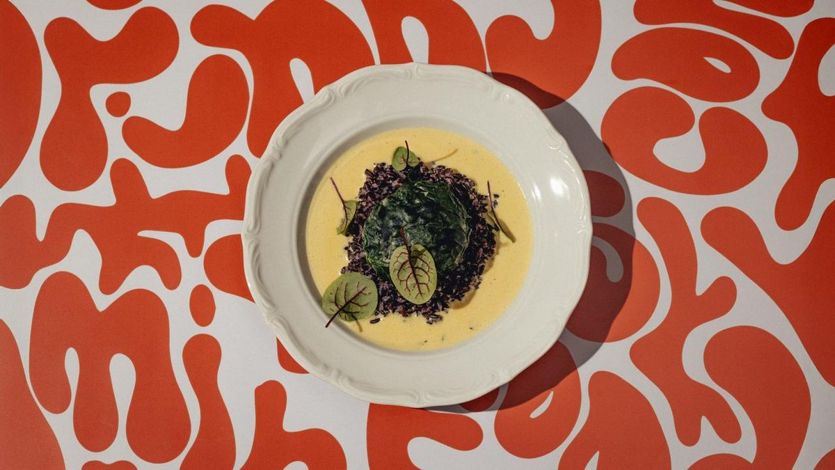 Каша из зеленой гречки и шампиньонов со сливками, в сочетании с поджаренным фундуком и муссом из пармезана