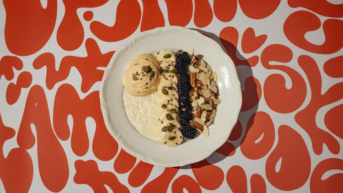 Рисовая каша с бананом и ягодами с миксом орехов и муссом из вареной сгущенки