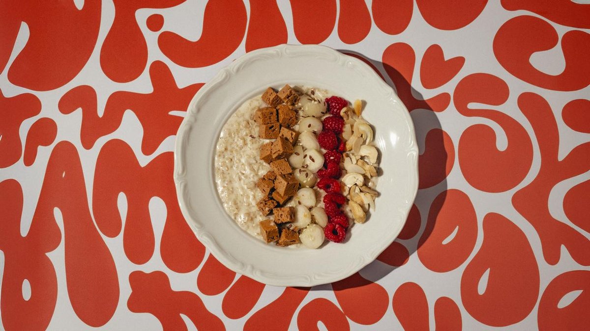 Каша овсяная с иримшиком, грушей и сезонными ягодами, с миксом из орехов