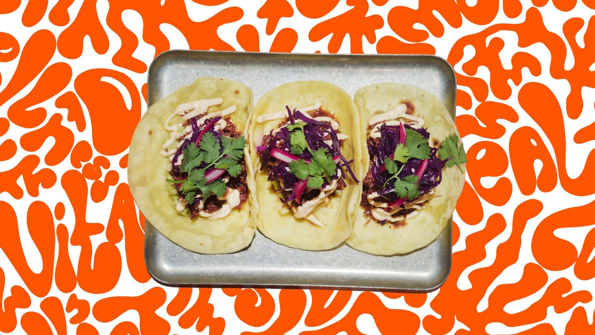 Тако из картофельной лепёшки с томлёной говядиной, маринованной капустой и гуакамоле