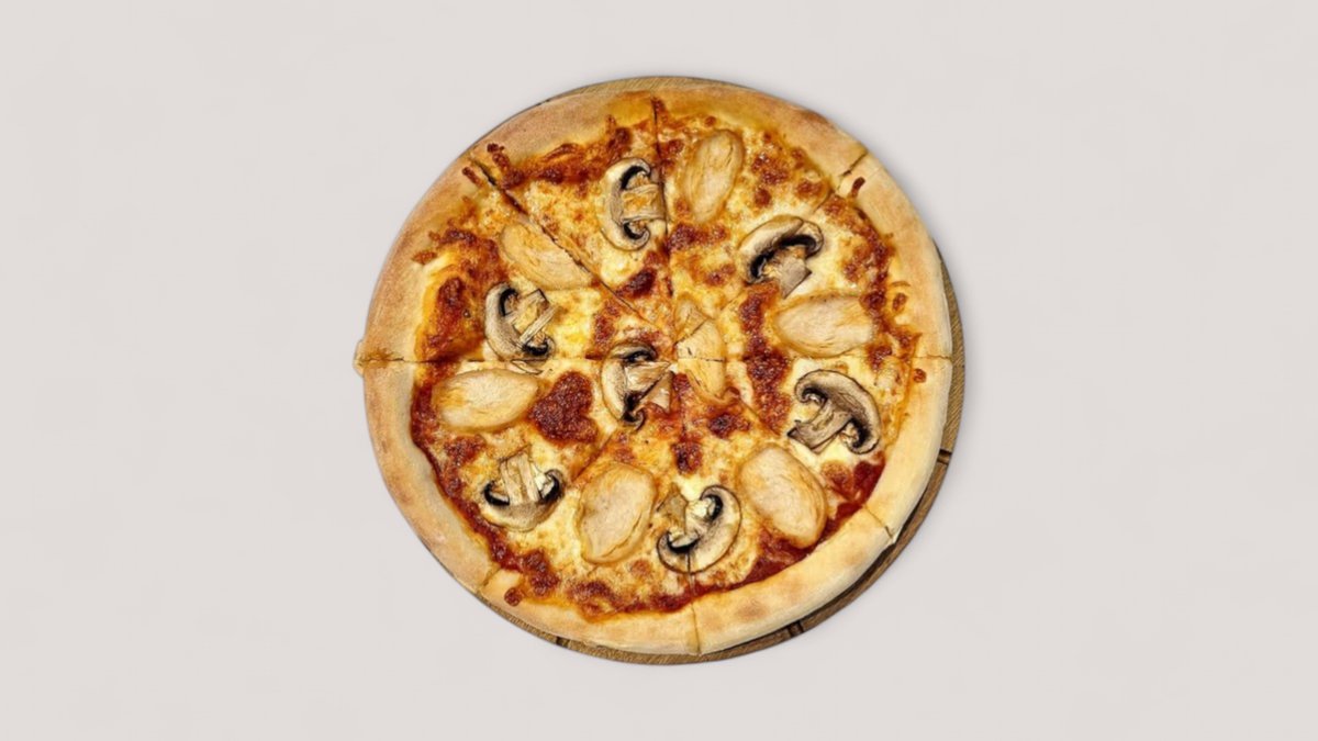 Пицца с курицей и грибами — нежная куриная грудка, шампиньоны, тягучая моцарелла и ароматный соус на тонком тесте. Сытная и насыщенная по вкусу 🍕