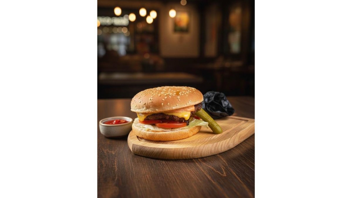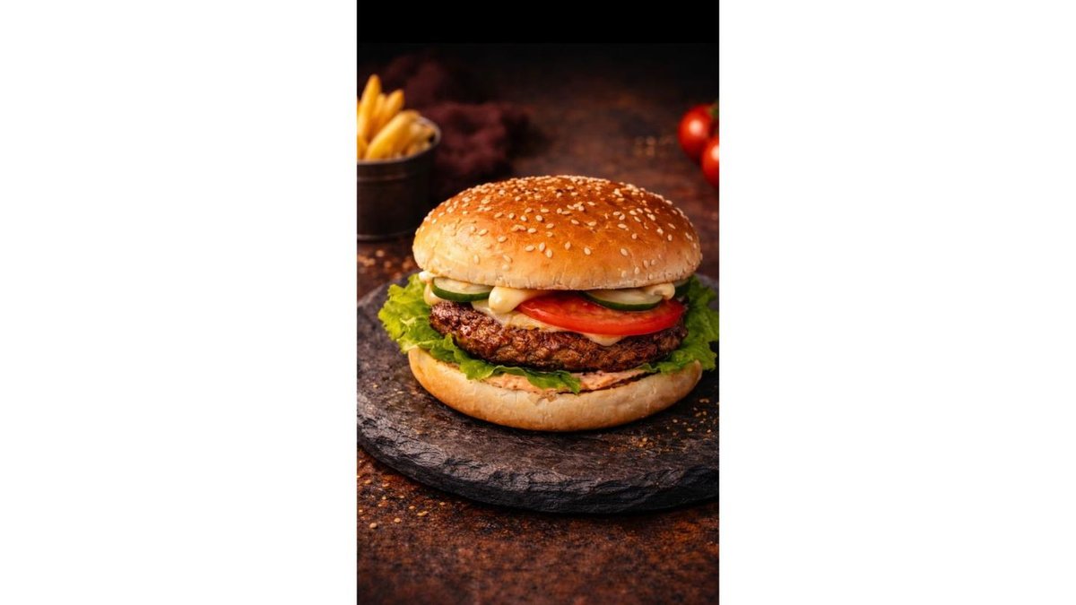 Булочка, огурцы маринованные, котлета говяжья, лук, помидор, айсберг, сыр гауда, соус