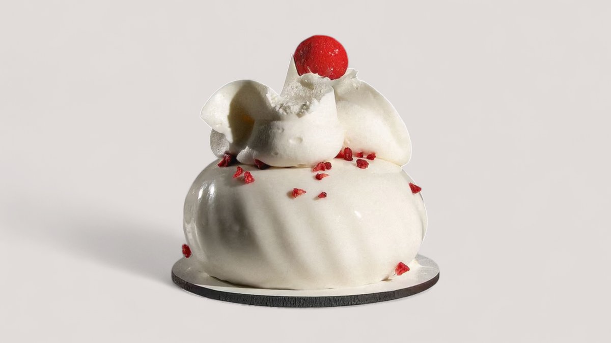 Песочная основа, фисташковый бисквит, малиновое конфи, свежая клубника, ванильный крем и изумрудные фисташки