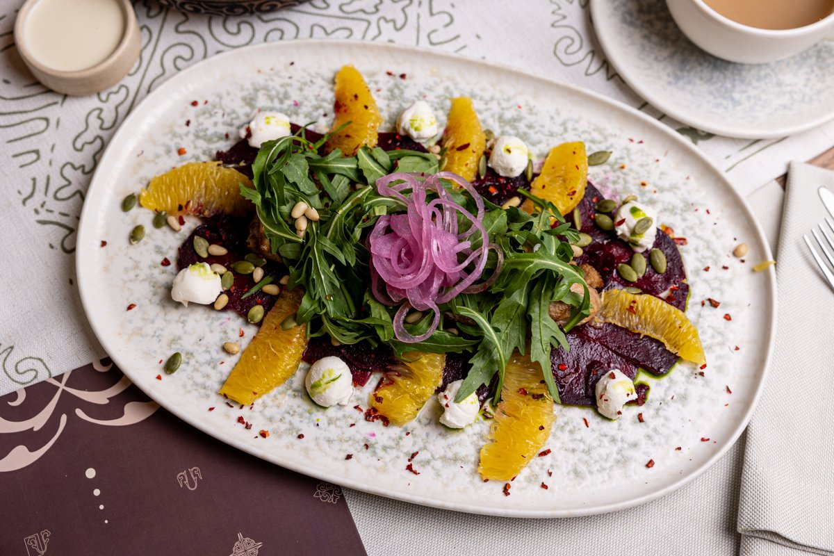Утиное филе су вид на гриле с карпаччо из печеной свеклы и дольками апельсина