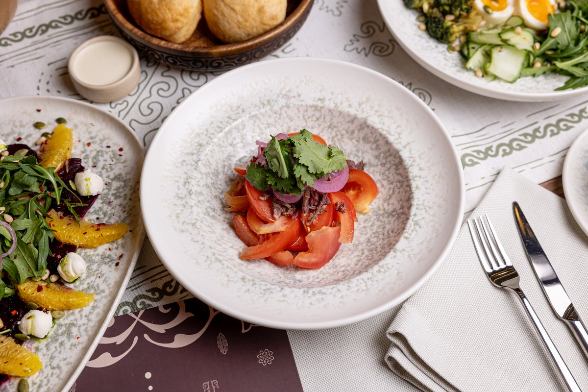 дольки сочных томатов с маринованным красным луком и пастрами из конины