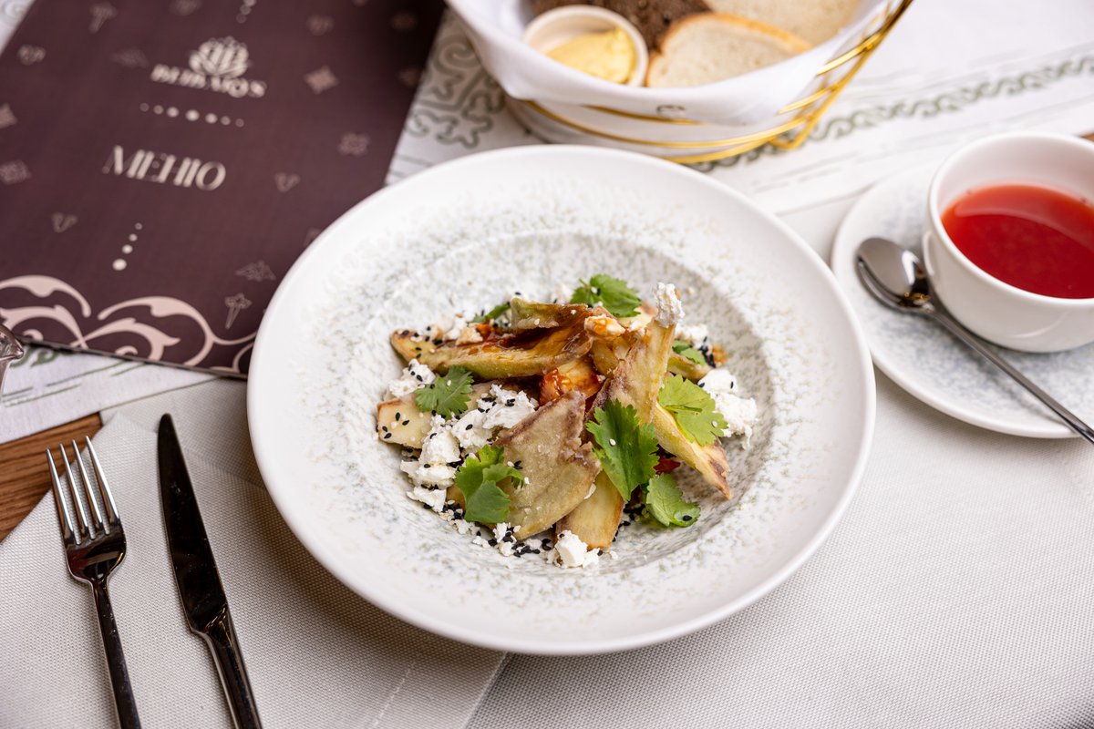соломки вареного телячьего языка и казы в сочетании с солеными и свежими огурцами с картофелем пай и домашним майонезом