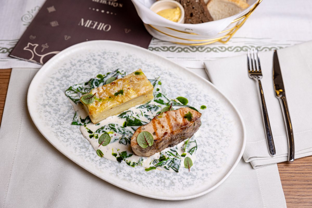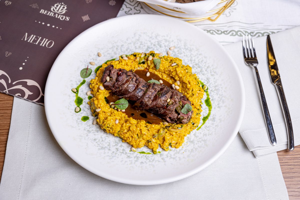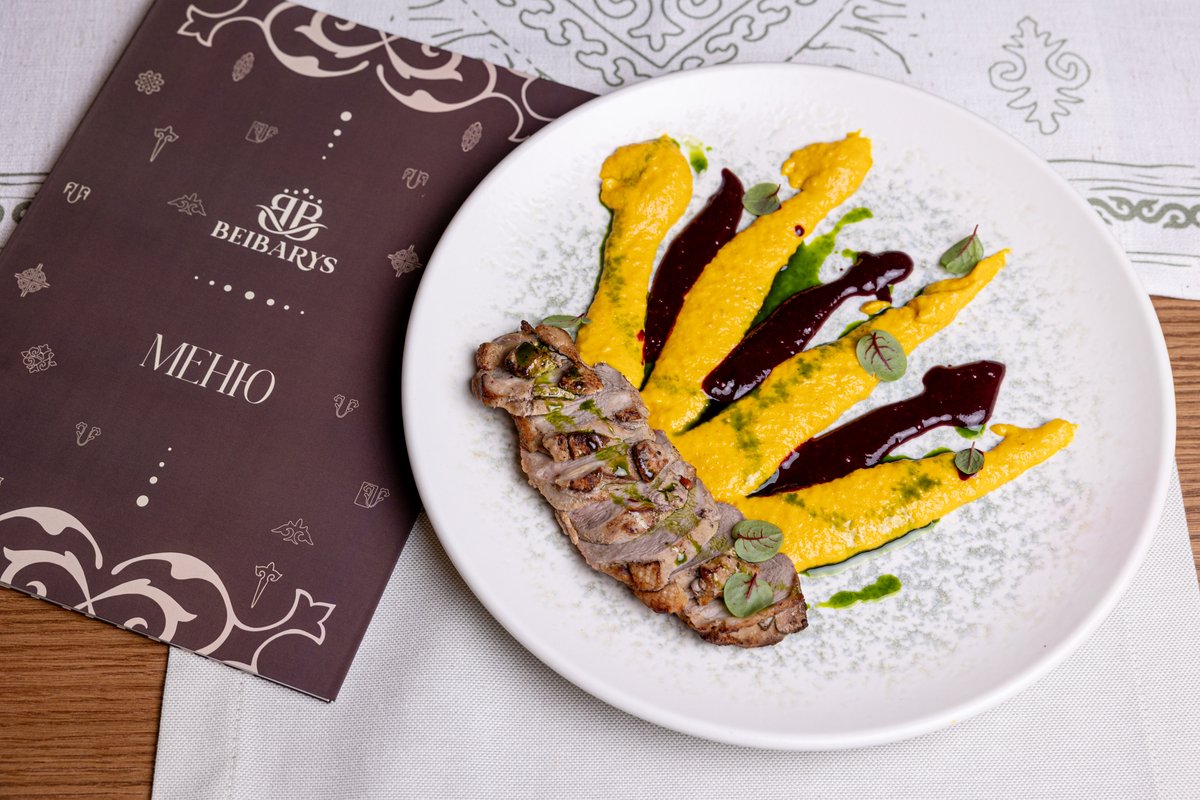 слайсы из телячьей вырезки и курдюка на гриле с авторским соусом)