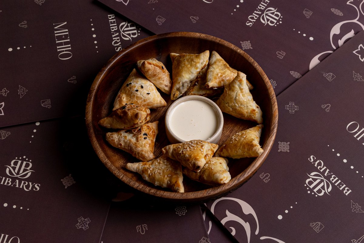 сет из 3 начинок: конина, индейка, грибы, подается с копченой сметаной