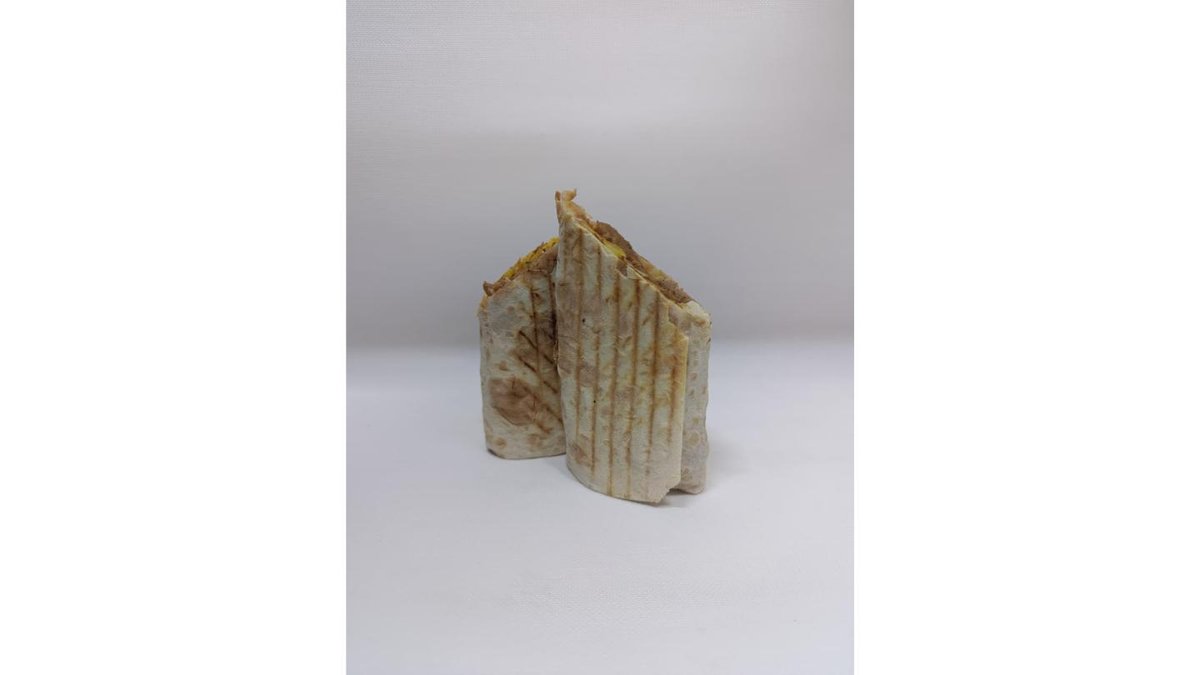 Lavash, beef, fries, mayonnaise, ketchup, cucumber, tomato, cheese sauce
