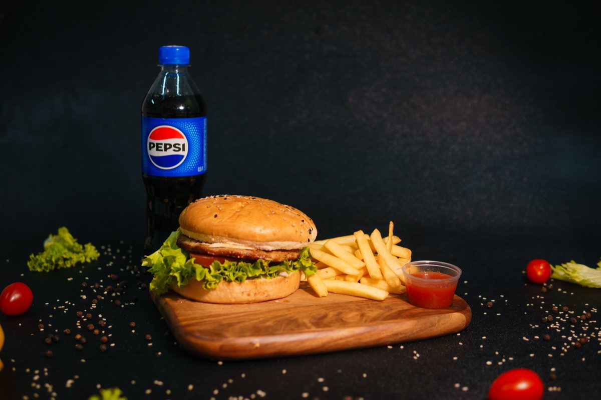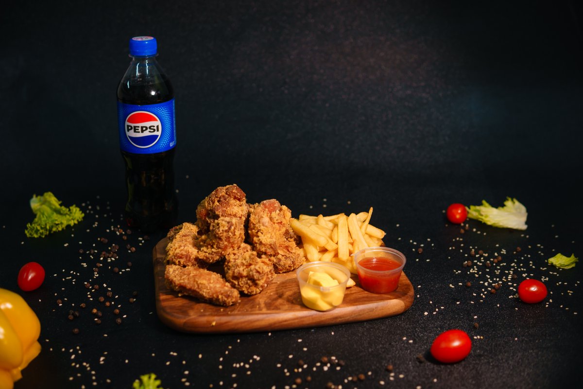Beef burger, 6pcs nuggets, 5pcs wings, 0.5L Pepsi Wings 8pcs Nuggets 6pcs Fries French fries