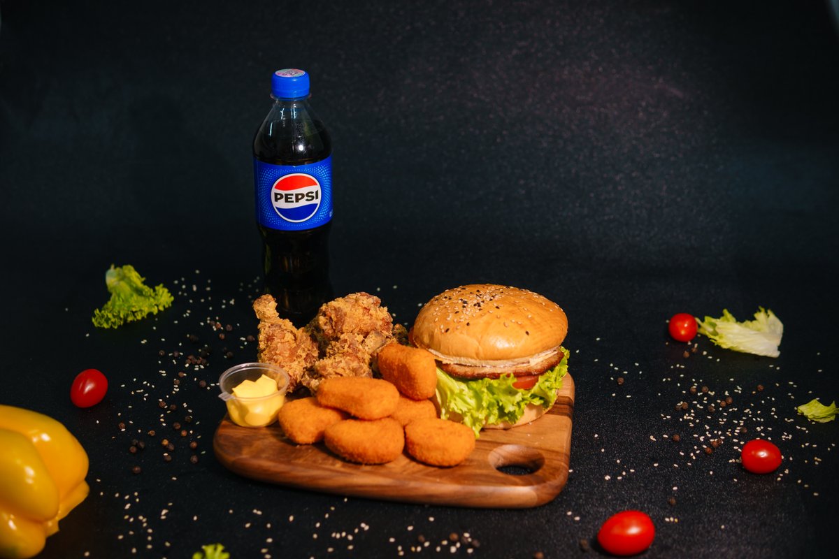 Chicken burger, 6pcs nuggets, 5pcs wings, 0.5L Pepsi