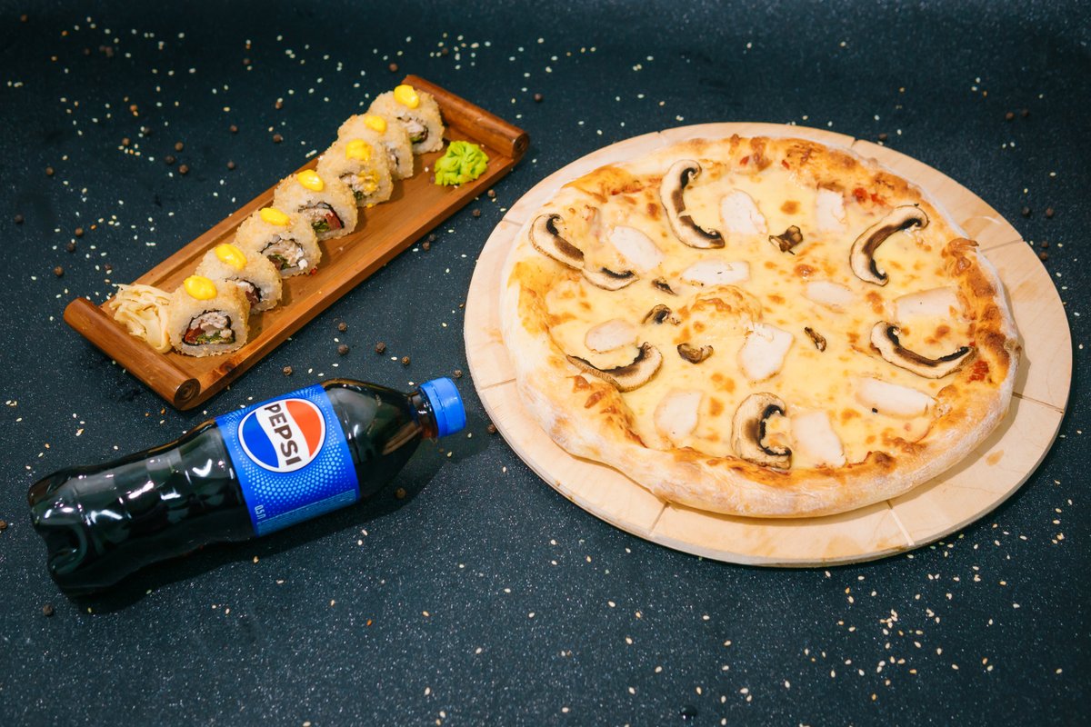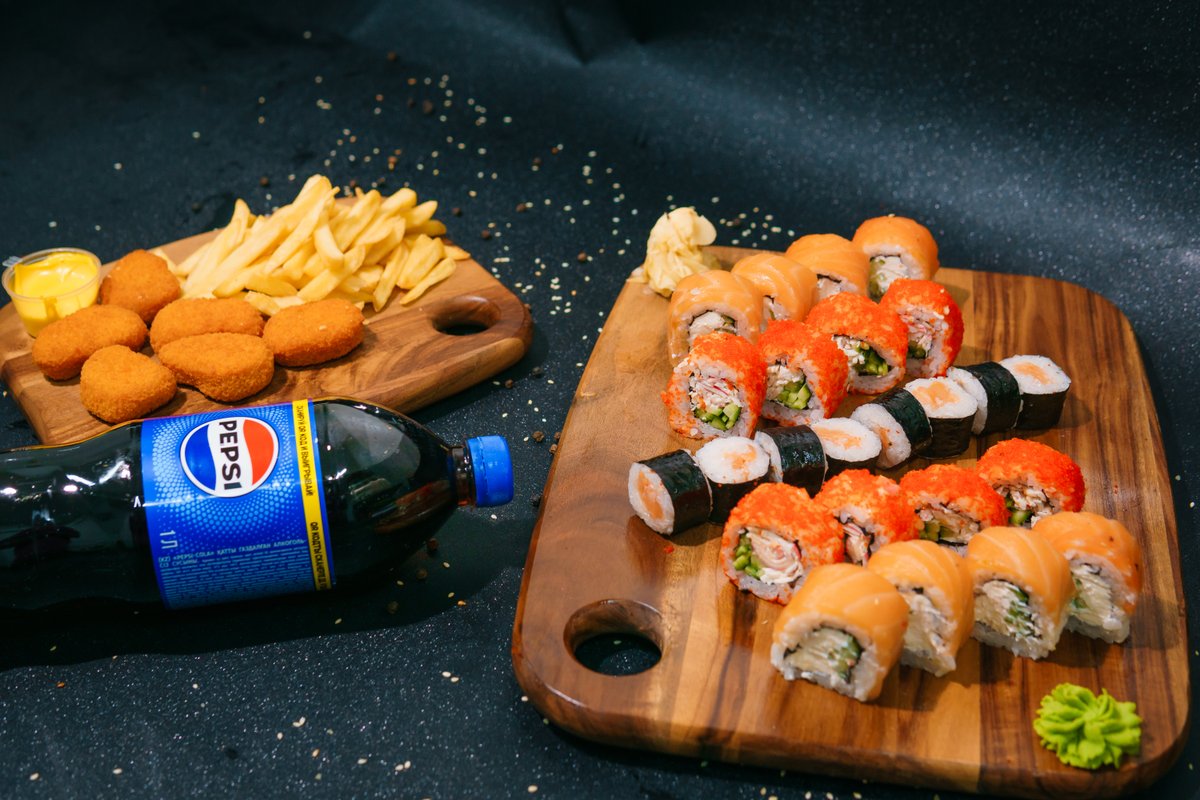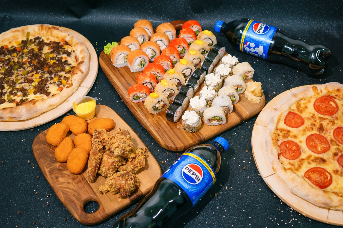 Philadelphia, California, Caesar Tempura, Shrimp Tempura, Crab Maki, Alaska, Mexican Pizza, Margherita Pizza, 5pcs Wings, 6pcs Nuggets, 2L Pepsi