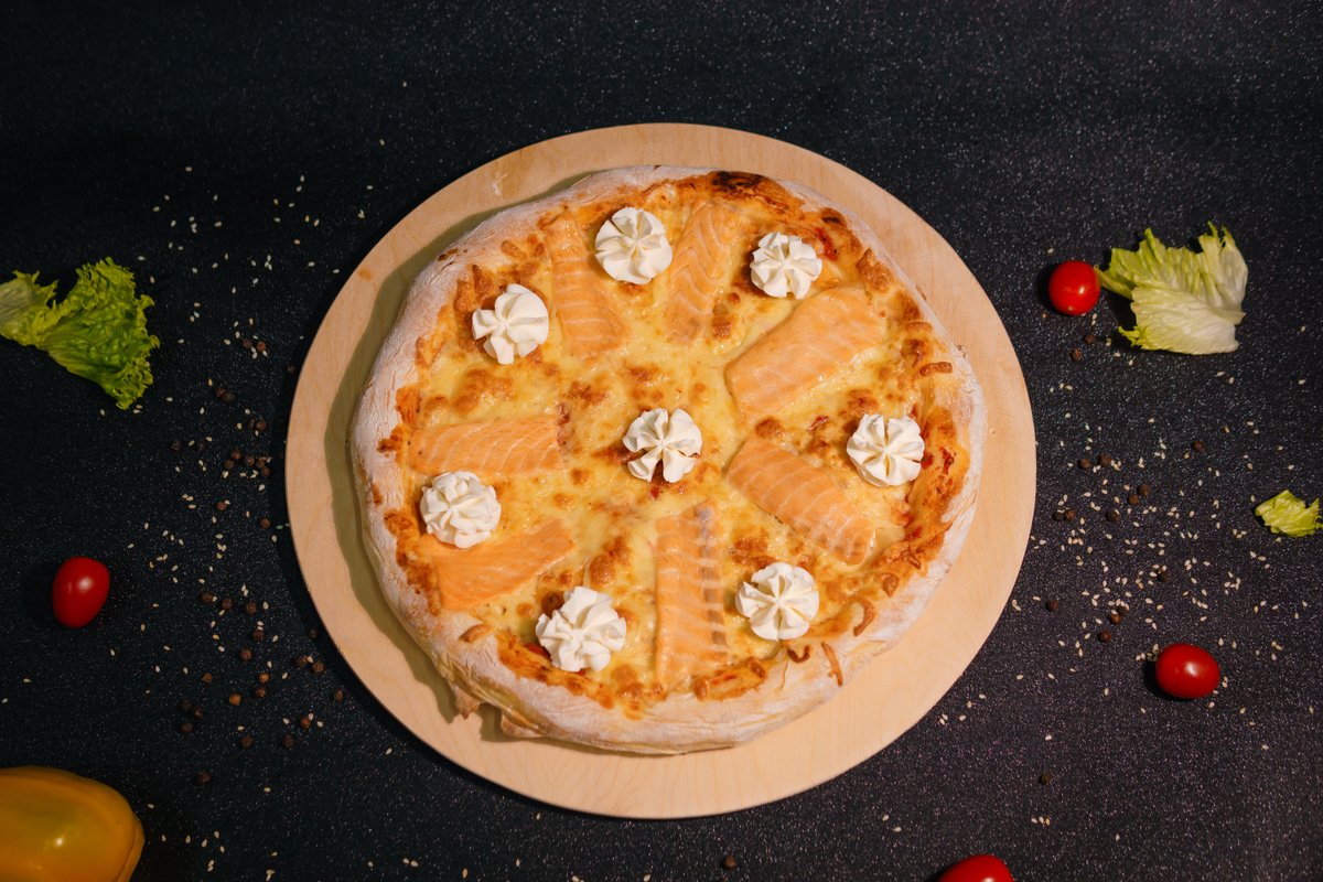 Dough, pizza sauce, mozzarella, salmon, Cremette cheese