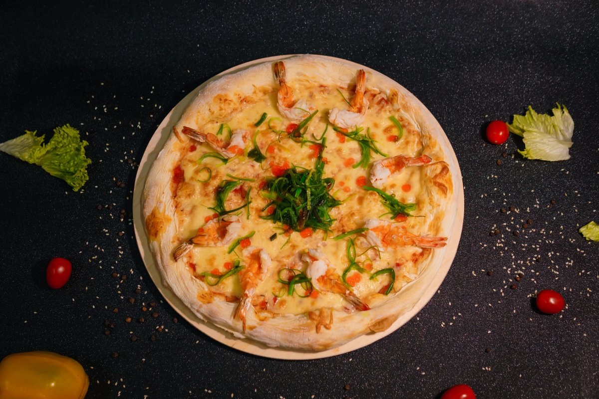 Dough, pizza sauce, mozzarella, shrimp, caviar, chuka salad