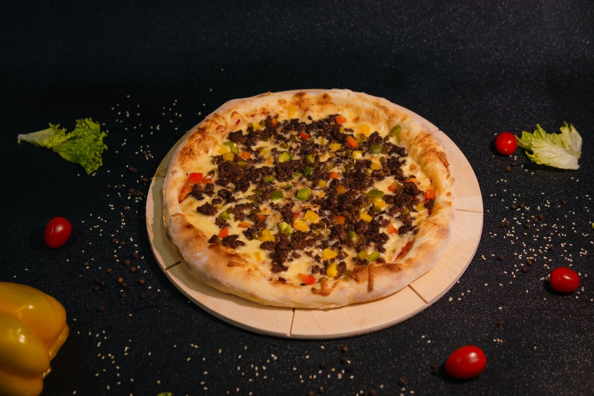 Dough, pizza sauce, mozzarella, minced meat, bell peppers, jalapeños