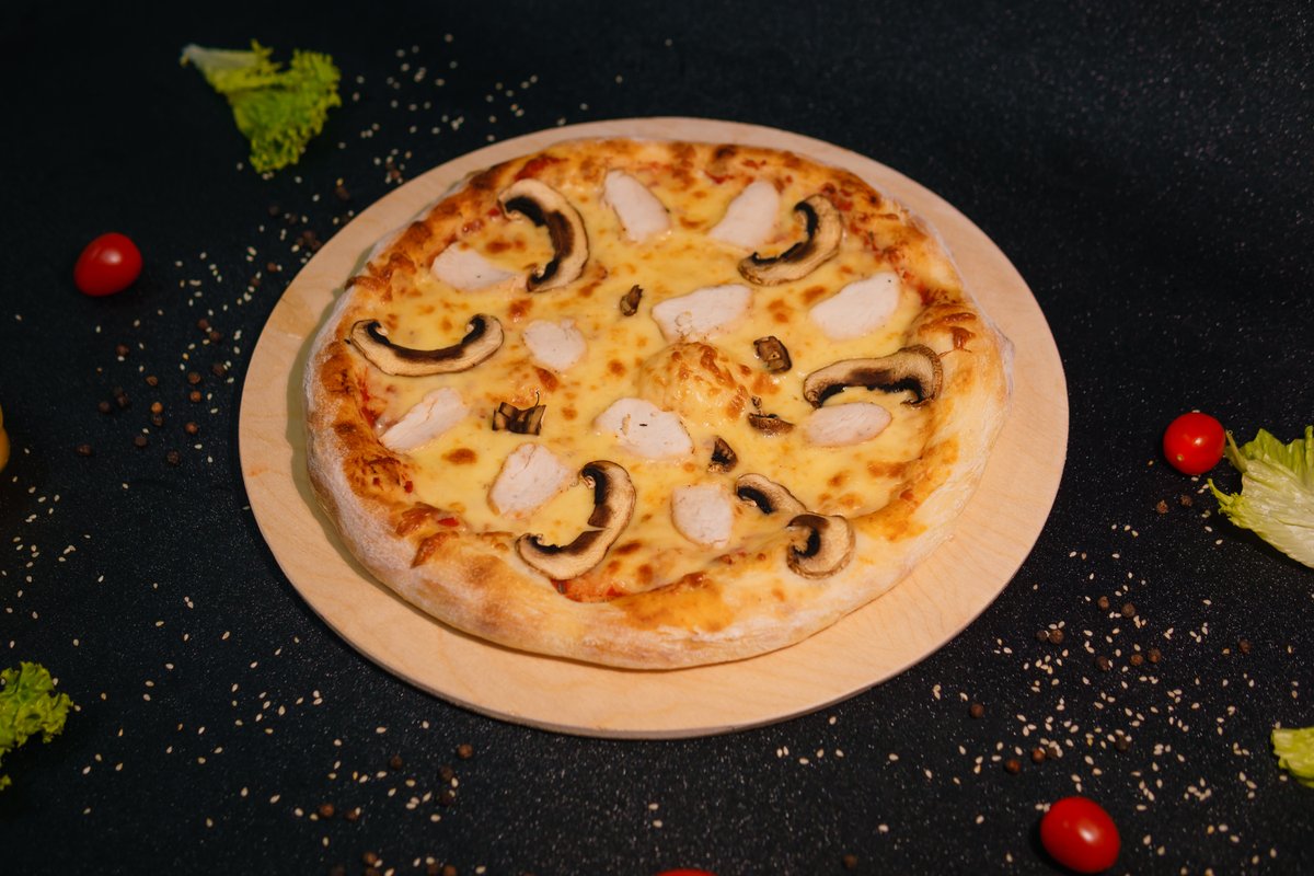 Dough, pizza sauce, mozzarella, chicken fillet, mushrooms