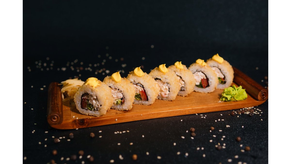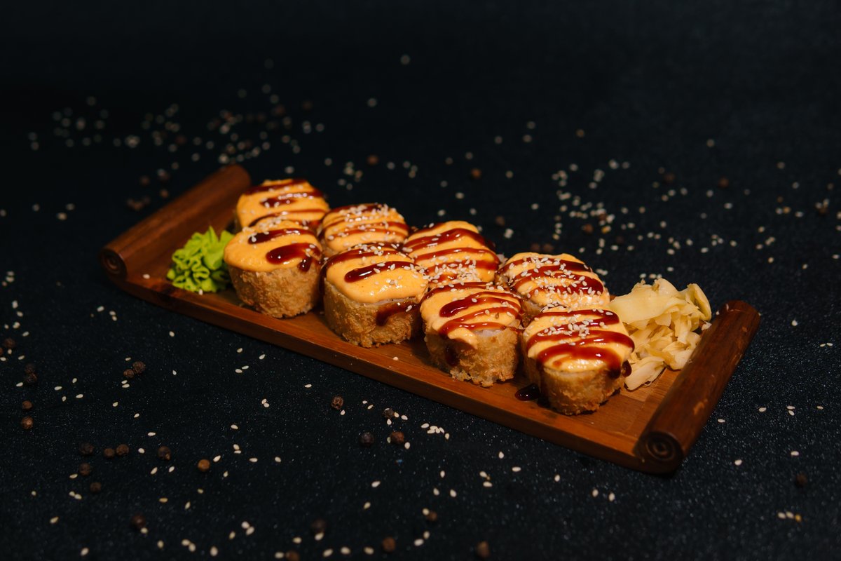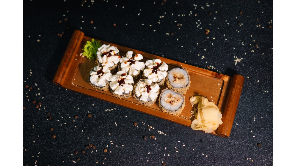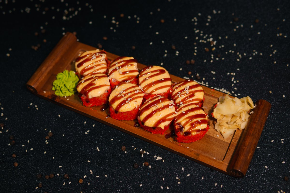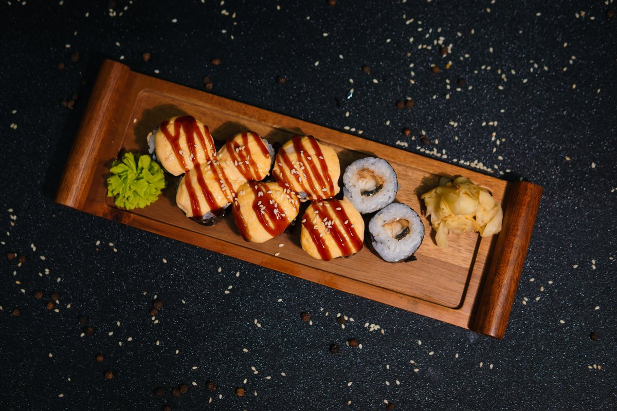 Nori, rice, crab, baked sauce, unagi sauce, sesame seeds