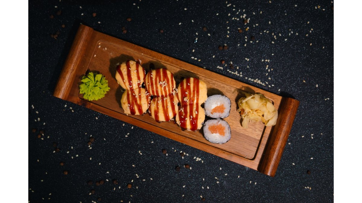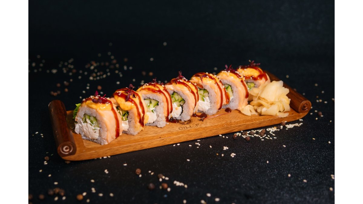 Nori, rice, cheese, cucumber, salmon, baked sauce, unagi sauce, sesame seeds