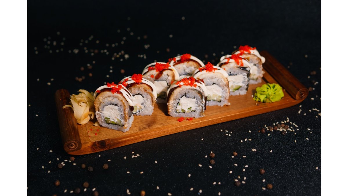 Nori, rice, Cremette cheese, cucumber, tobiko, eel, white sauce, unagi sauce, sesame seeds