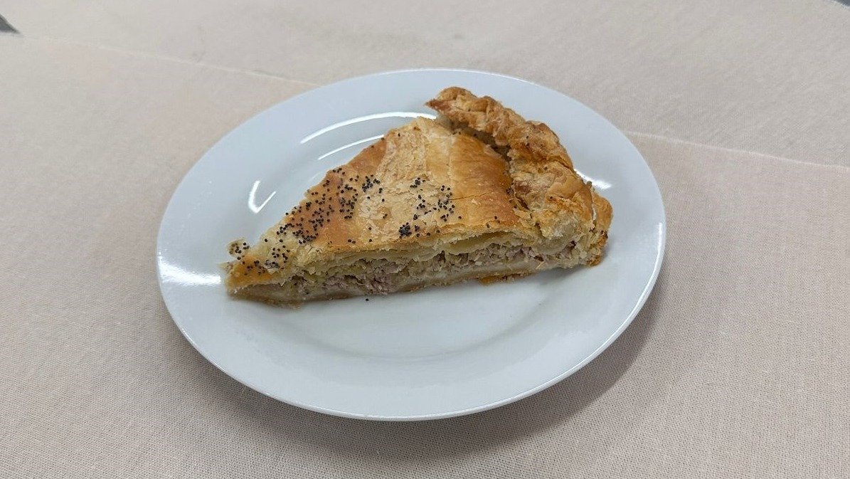 Тесто слоено-пресное, фарш говяжий, картофель, лук