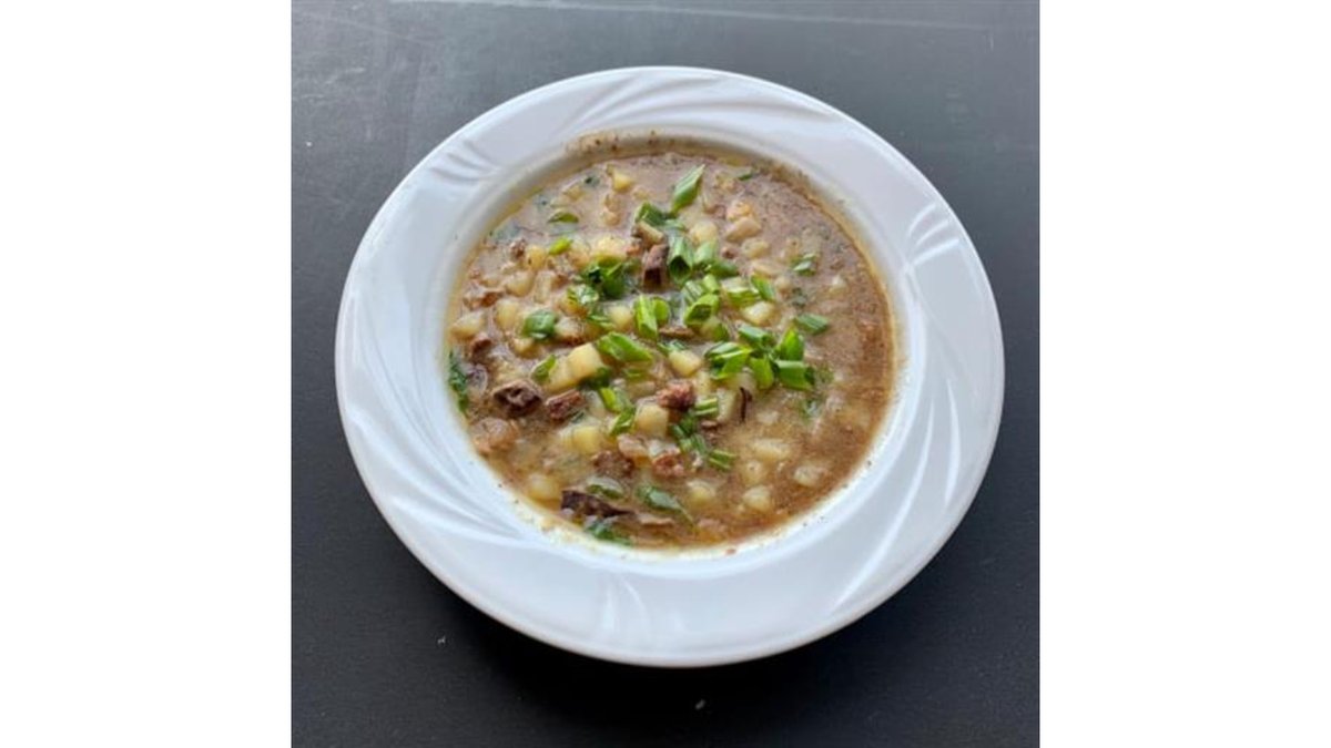 Бульон из говядины с добавлением картофеля, моркови, лука репчатого, казы .Подается с уйгурской лепешкой.