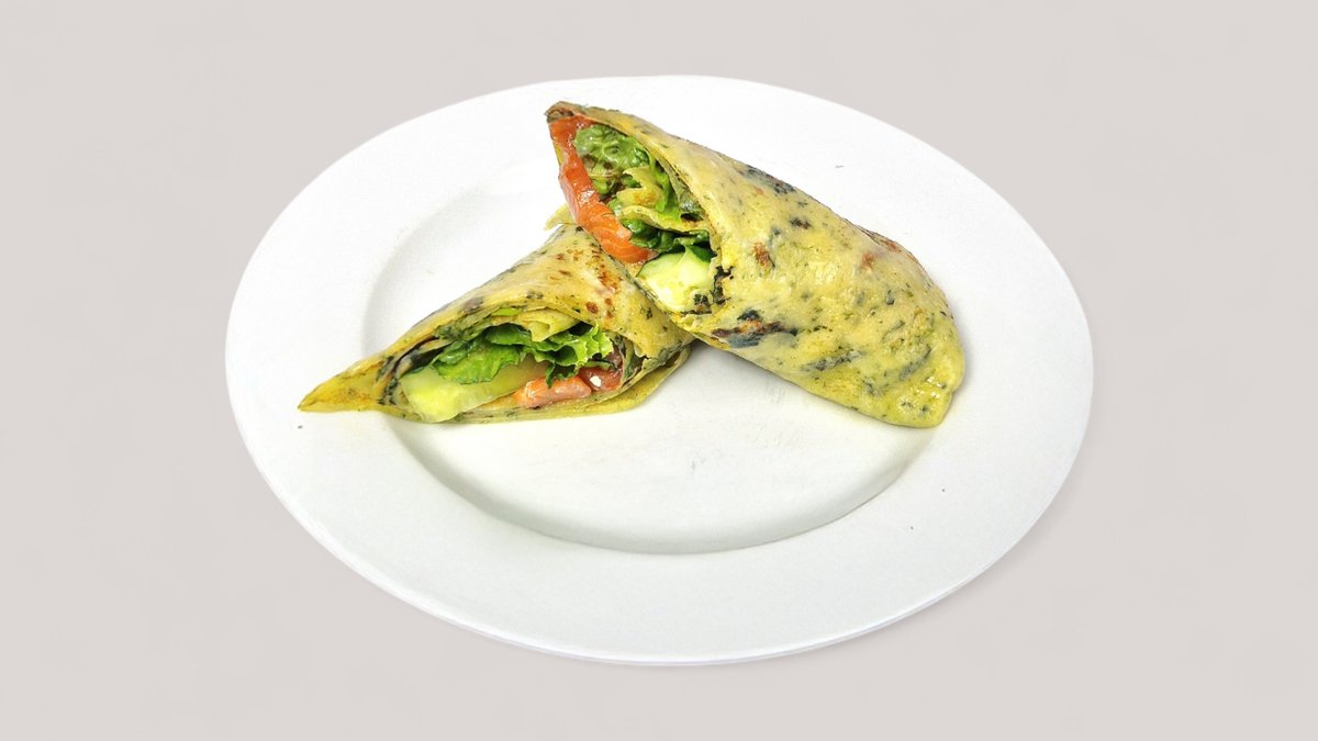 Блин со шпинатом и начинкой из форели, свежего огурца и листа салата. 170 гр.
