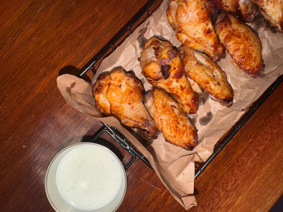 Куриные крылья обжаренные в специях подаются с сырным кремом на основе сливок сыра ракфор и зеленого лука