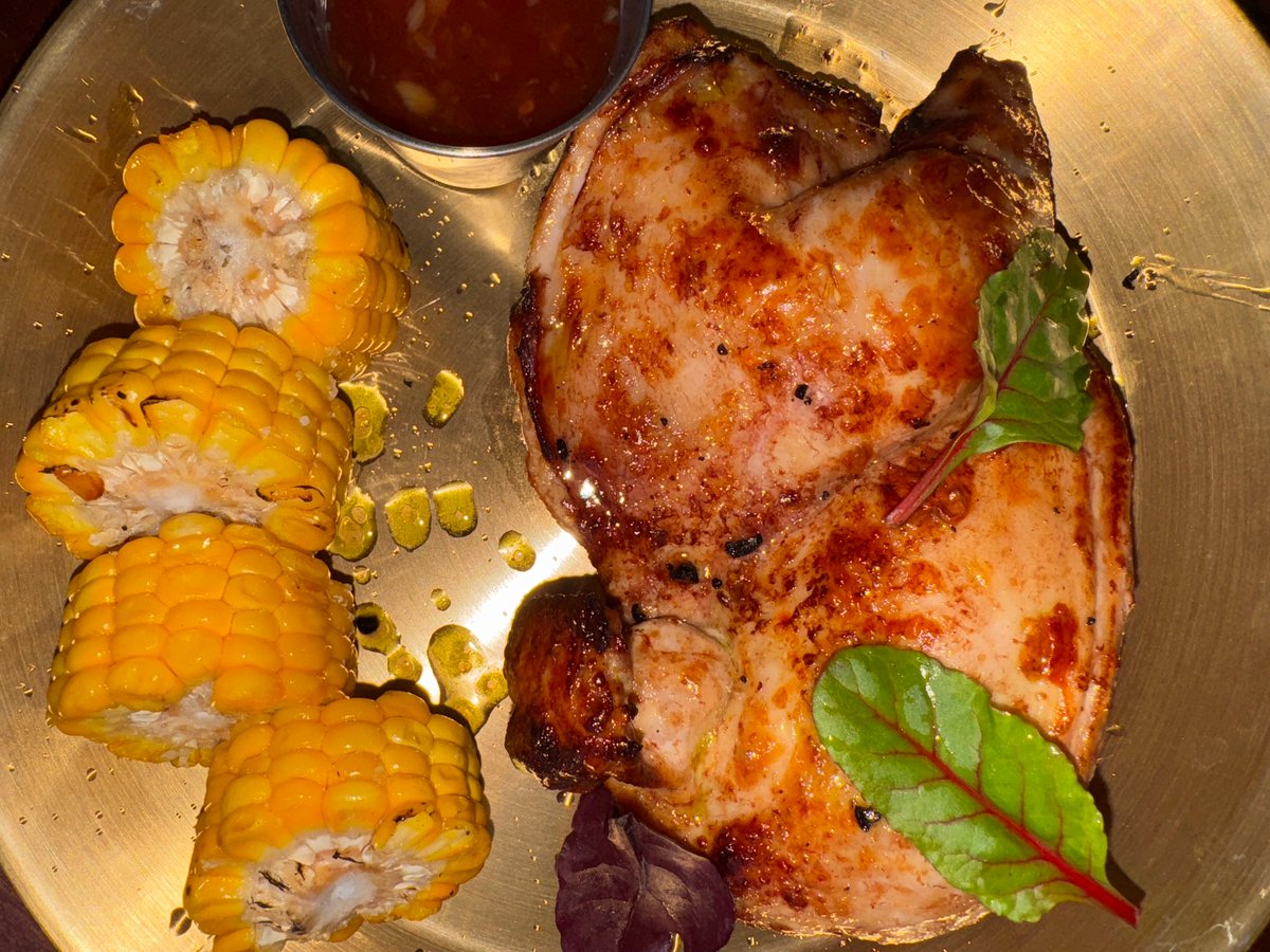 Цыпленок маринованный в соусе хой син и запеченный в печи, кукуруза гриль