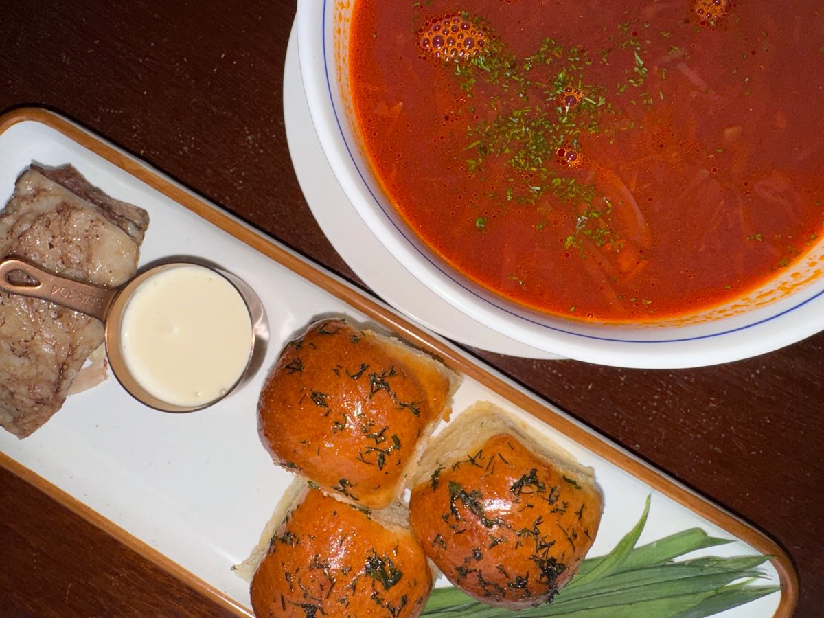 Подается с говяжьим ребром, чесночными пампушками, домашней сметаной и зеленью