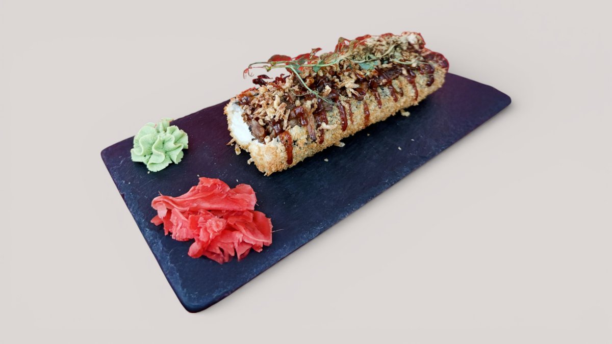 Нежный тунец, плотный рисовый шар и фирменный сливочный крем от шефа. Завершающий штрих — соус унаги и икра, которые добавляют глубину вкуса и лёгкую сладость.