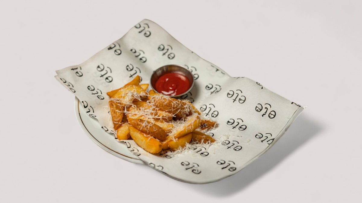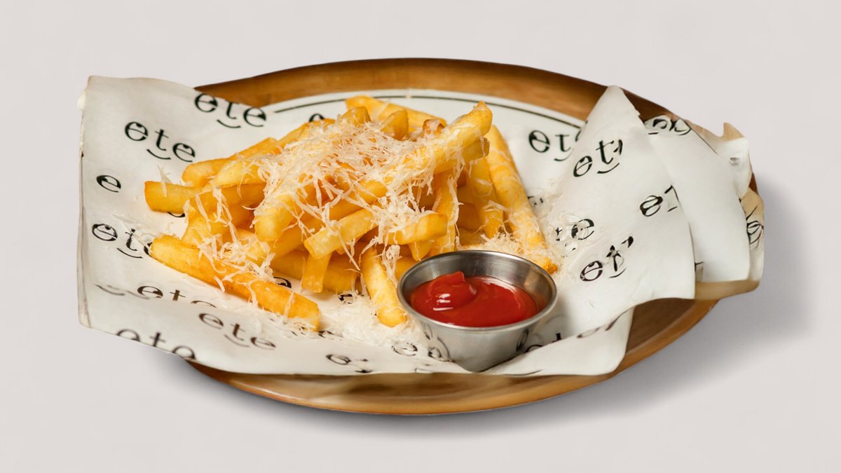 Куриный шницель с пармезаном, с соусом, черным перцем и фри