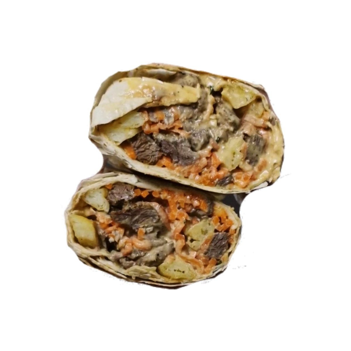 Филе говядины ,фри ,корейская морковь,фирменый соус ,лаваш