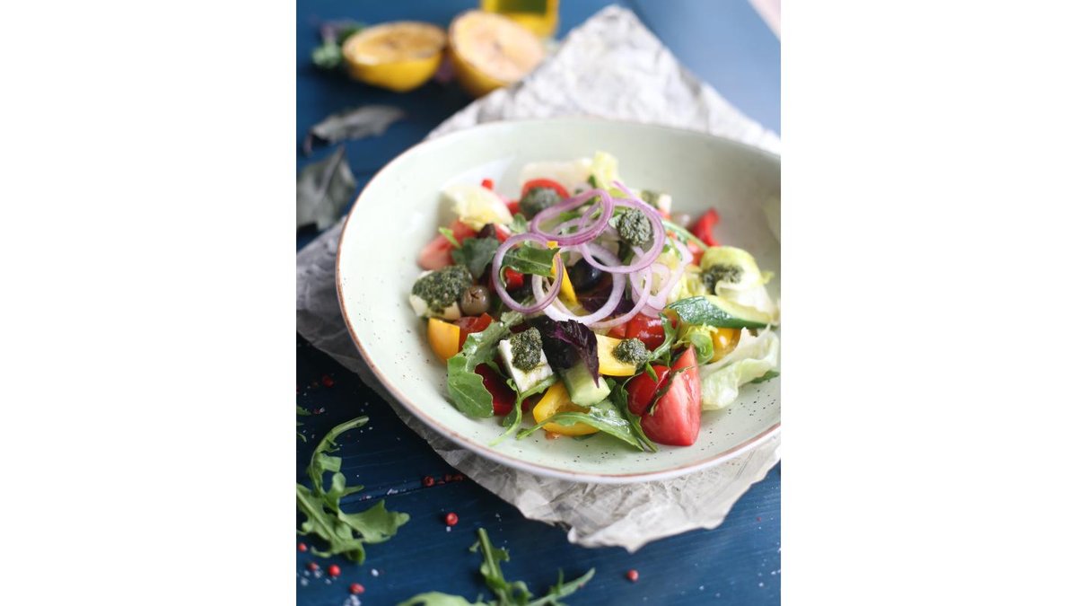 Сыр Фетакса, маслины, руккола, базилик, огурец, паприка, помидоры, красный лук, салат Айсберг, цитрусовый дрессинг.