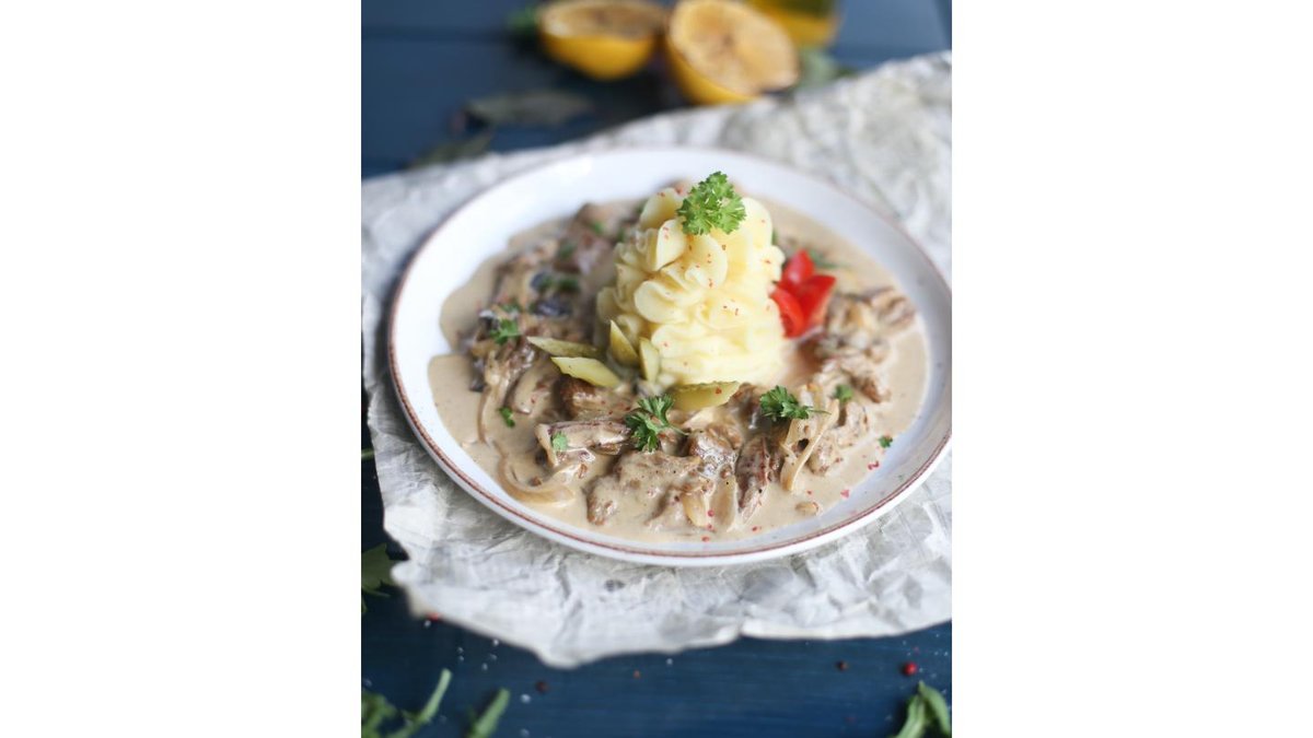 Телятина по – строгановски на картофельном пюре