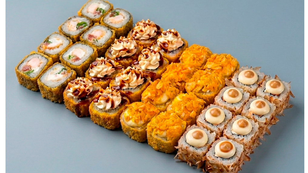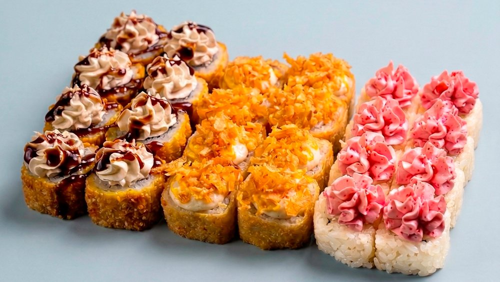 Запеченный ролл с лососем и стружкой тунца 8 шт, Цезарь с начос 8 шт, Цезарь ролл 8 шт, Жареный ролл с лососем и снежным крабом 8 шт.