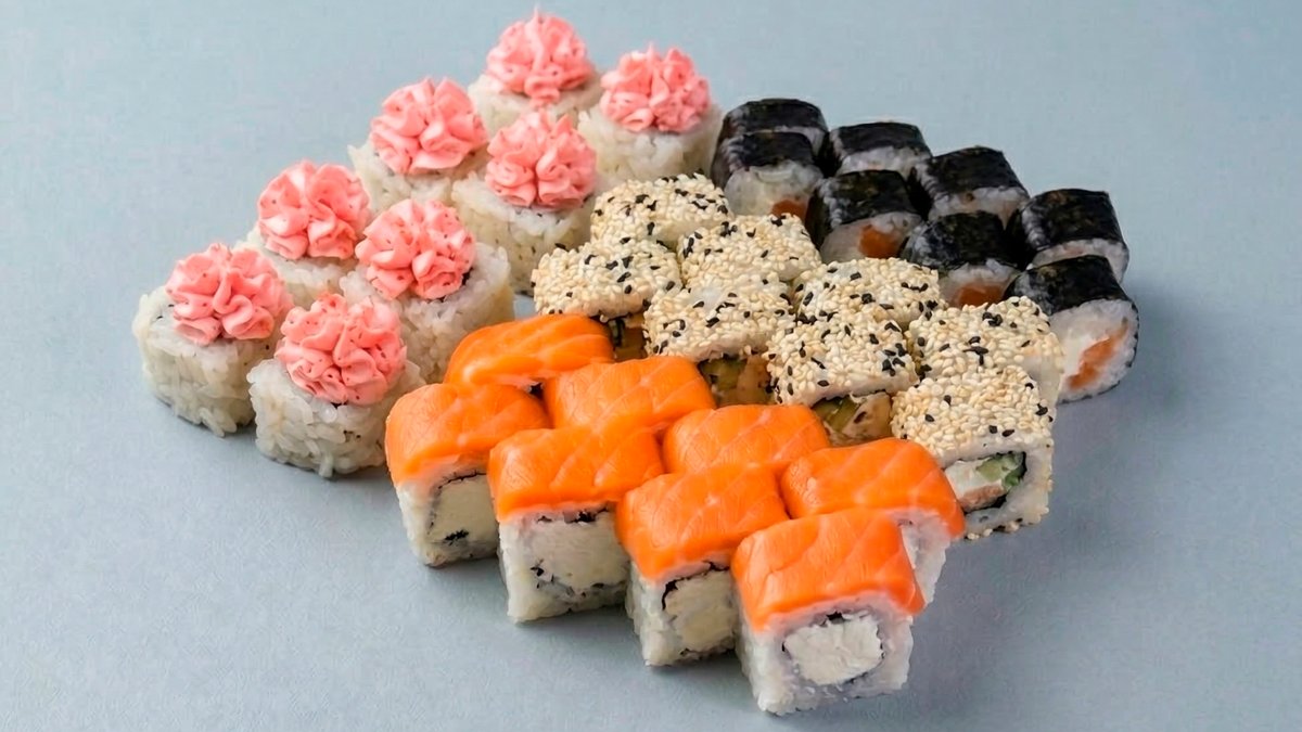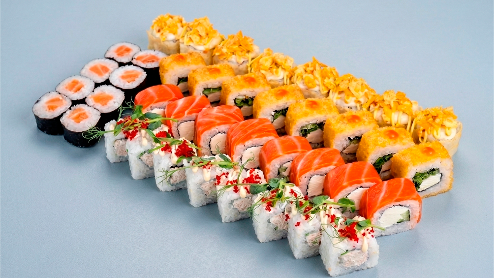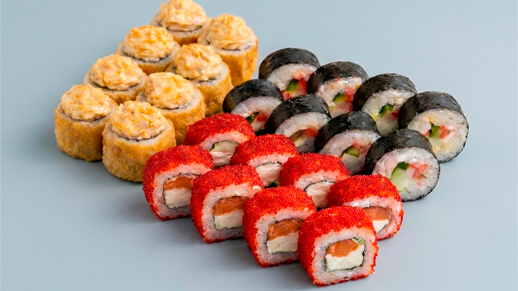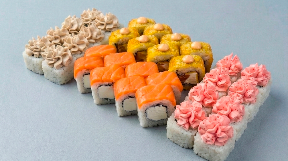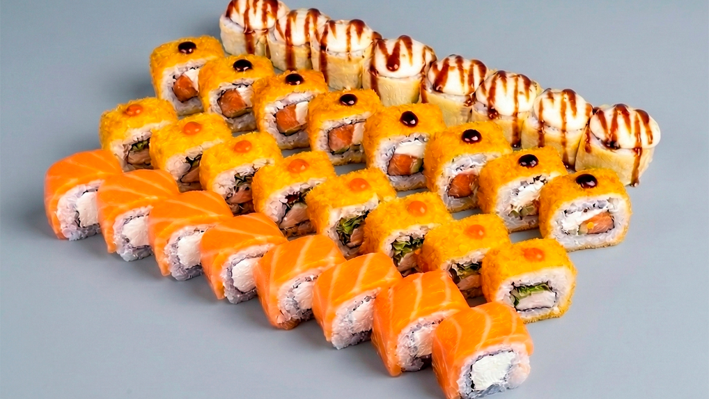 Фила-лайт 8 шт, Киото маки 8 шт, Сливочный ролл с лососем 8 шт, Ролл с лососем и шапкой лава 8 шт.