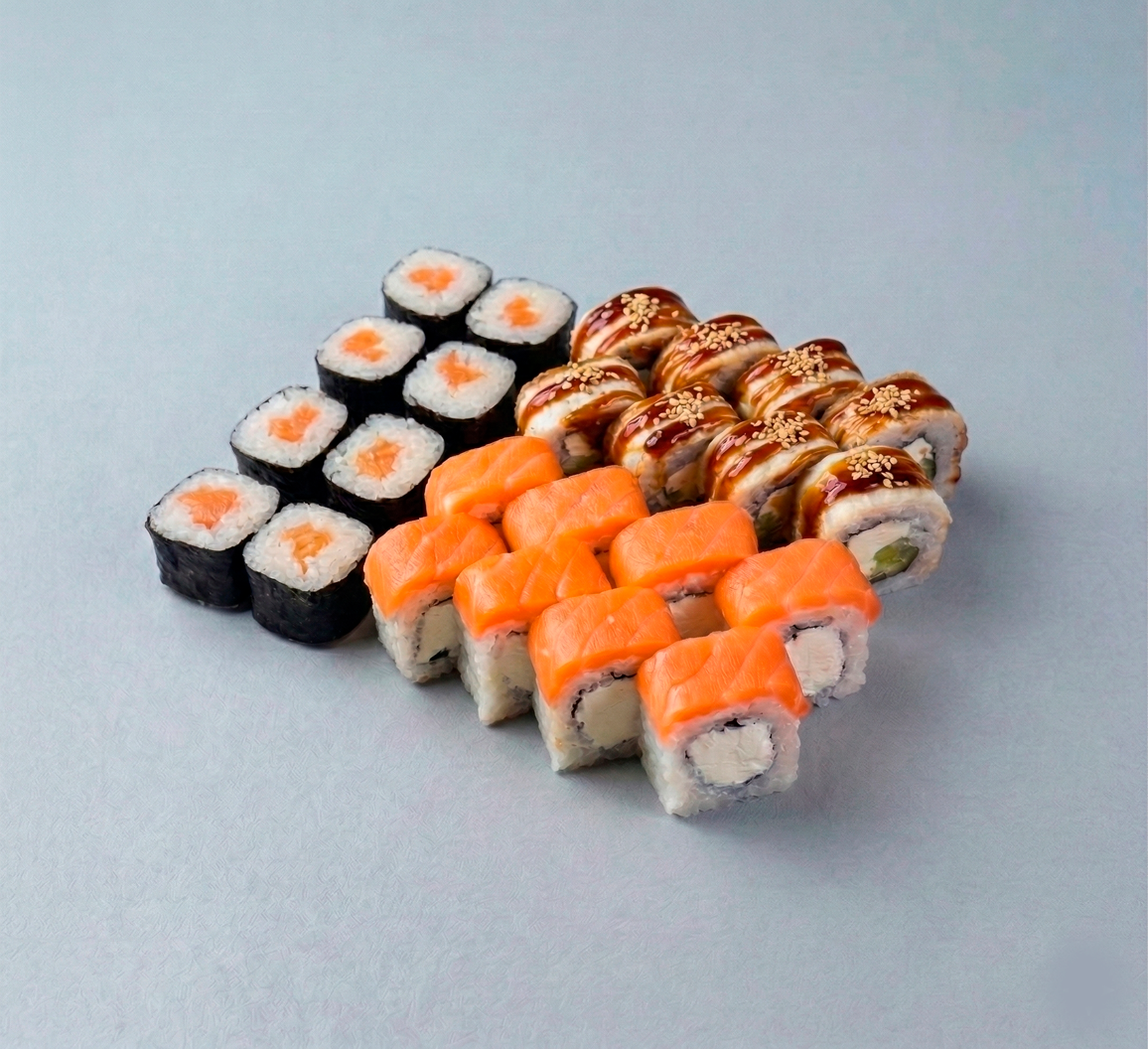 Унаги онигара 8 шт, Фила-лайт 8 шт, Ролл с лососем 8 шт.