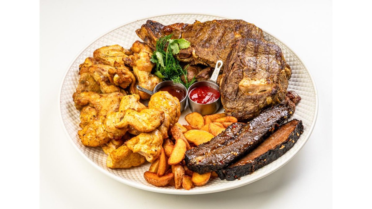Served on two plates: bone-in ribeye, boneless ribeye, chicken fillet, wing, brisket, wedges, sauces