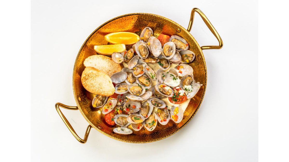 Vongole, cream, coconut milk, parsley, bell pepper, cherry tomatoes, saffron, lemon
