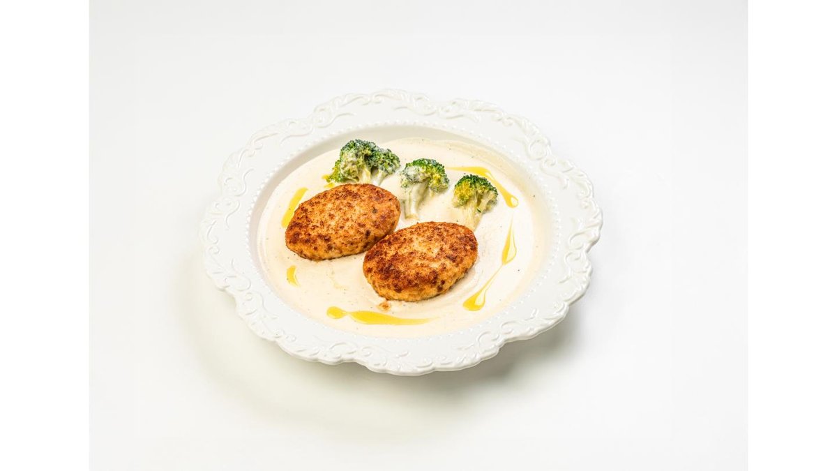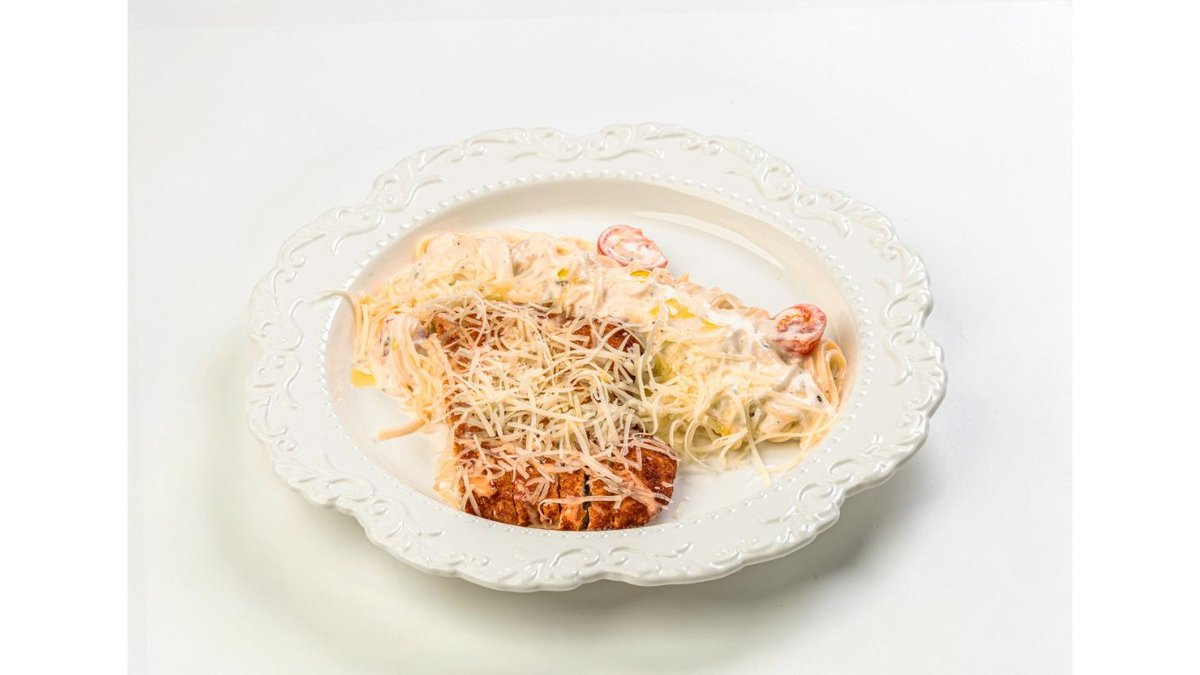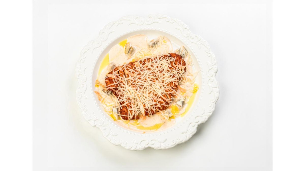 Breaded chicken fillet, mushrooms, cream, cilantro, sweet sauce, Parmesan