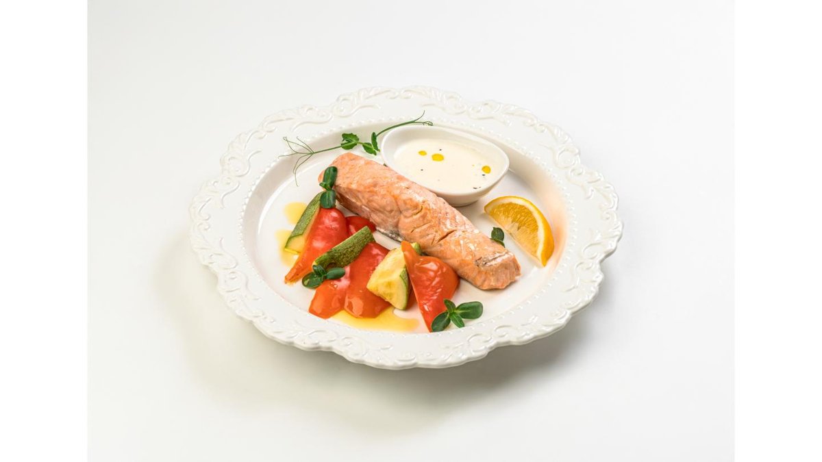Pike perch, salmon, broccoli, zucchini, carrots, cherry tomatoes, spinach