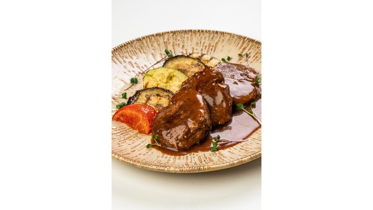 Horse medallion, demi-glace sauce, grilled vegetables