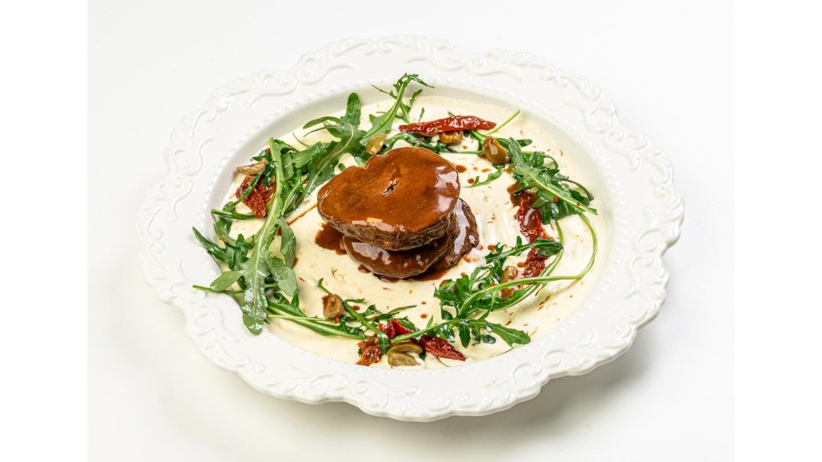 Saffron Sauce: onion, garlic, cream, saffron, horse meat mignon, demi-glace, arugula, grilled olives, sun-dried tomatoes