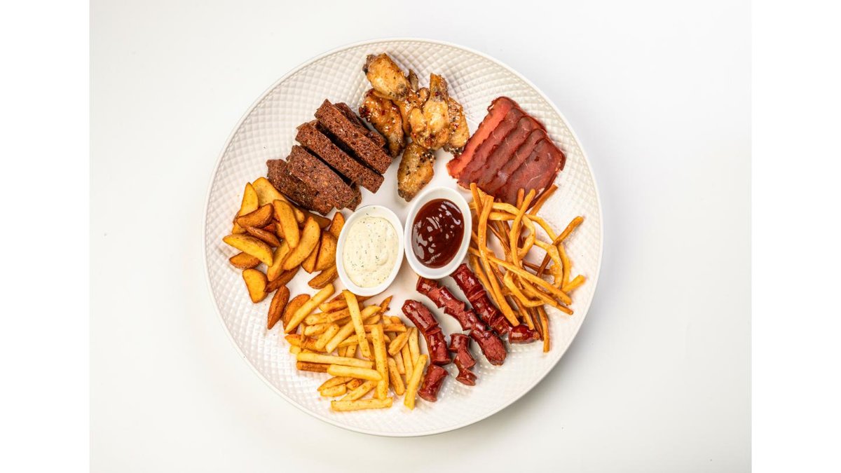 Basturma, garlic croutons, fried chechel, BBQ wings, French fries, potato wedges, ketchup, BBQ sauce